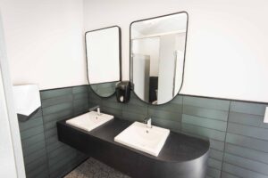 The structure is fully insulated, electrically heated, and sealed for use in cold or wet climates — ideal for coastal BC installations, school districts, or industrial projects. Interior finishes include easy-clean surfaces, commercial fixtures, and LED lighting, with optional mechanical upgrades for high-demand sites.
