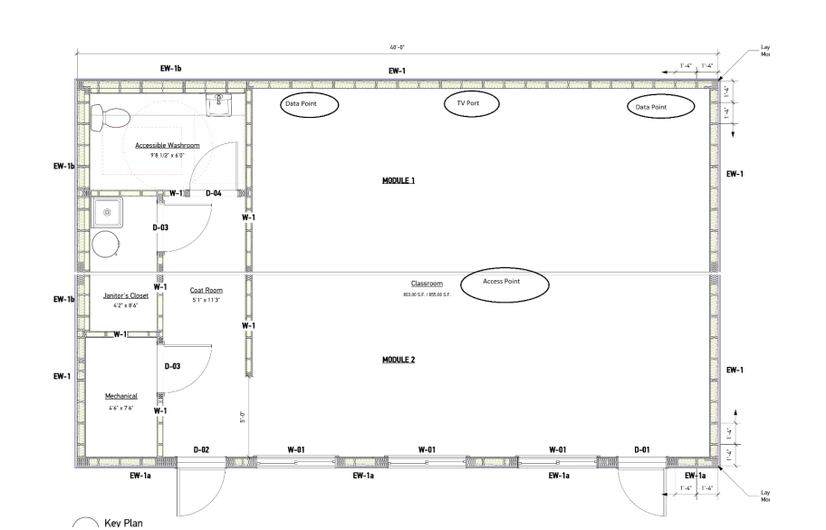 Built on the same 24×40 dual-module frame as the Alder, the Arbutus includes all of the features of our dry classroom units — including Tarkett commercial flooring, mud & tape drywall, multi-pane windows, a 200 amp panel, and efficient heat pump climate control — with the added benefit of a fully built-in washroom.