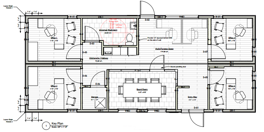 The Coastal is a 20′ x 48′ CSA A277-certified modular office unit designed for year-round occupancy and full-time use. This dual-module build includes four private offices, a large boardroom, a multi-purpose area, a kitchenette, a universal washroom, a storage room, and an entrance vestibule—all under one clean, efficient roofline.