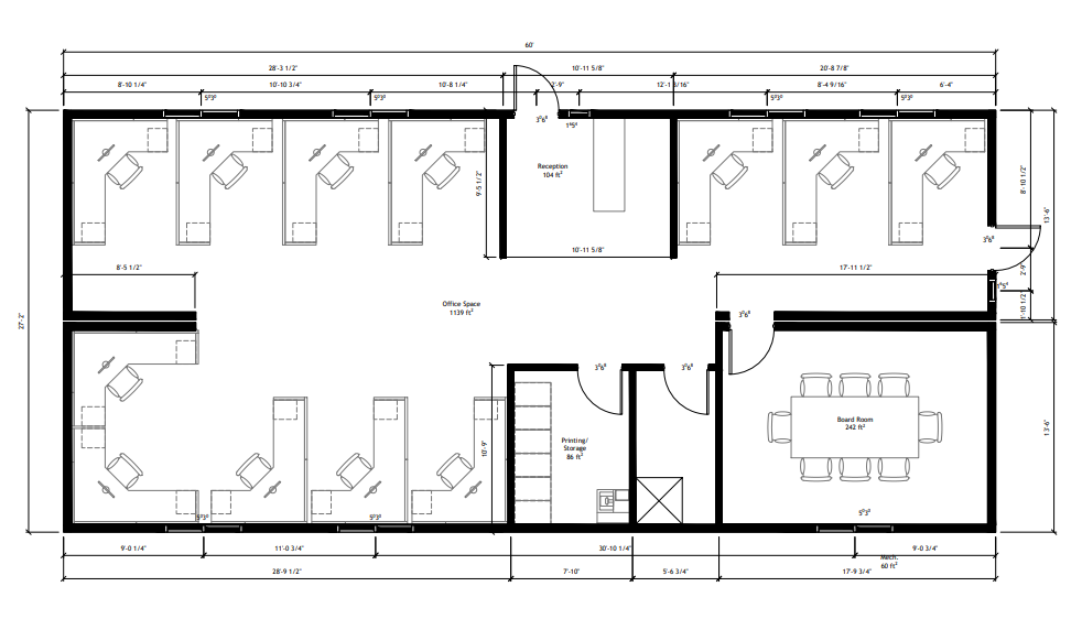 “The Miracle” features a contemporary modular layout tailored for team performance and visitor accessibility. This 27′ x 60′ permanent modular office includes a welcoming reception area, expansive open workspace, private offices, a full boardroom, and essential storage. With a smart mix of enclosed rooms and collaborative zones, it’s ideal for teams that need both privacy and flexibility. High-end finishes like Tarkett flooring, Milgard vinyl windows, and a natural wood exterior trim complete the space with warmth and style — all backed by structural engineering compliance and a 1-year manufacturer’s warranty.